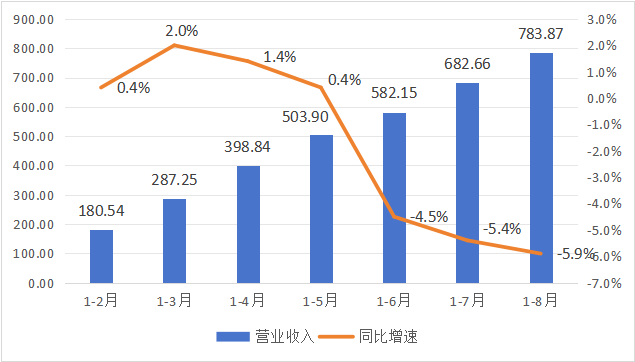 到7月結(jié)束時,營收升至682.66億元,同比下降5.4%;到8月結(jié)束時,營收升至783.87億元,同比下降5.9%,降幅連續(xù)兩個月放大。