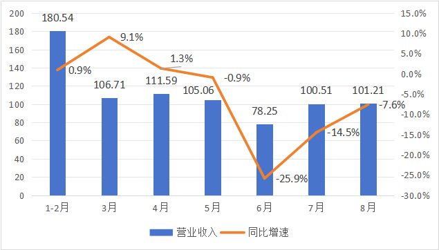 5月,營收為105.06億元,同比下降0.9%,增速由正轉(zhuǎn)負(fù);6月,為78.25億元,同比大跌25.9%;7月,為100.51億元,同比下降14.5%;8月,為101.21億元,同比下降7.6%。