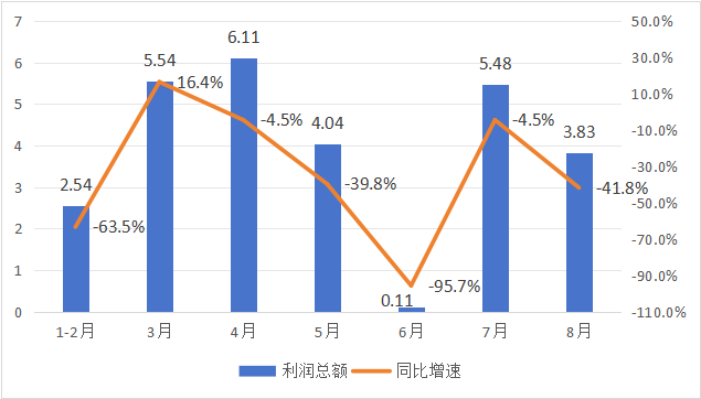 7月,利潤總額為5.48億元,同比下降4.5%;8月,為3.83億元,同比下降41.8%。